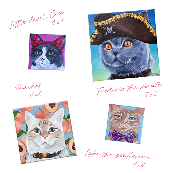 Capture your cat’s unique personality with a custom portrait in my signature style! Each painting showcases your kitty in bright colours sporting a fun accessory that matches their personality. Whether they’re a pirate, a princess, or a dapper gentleman, I’ll create a piece that brings out their quirks and makes you smile.